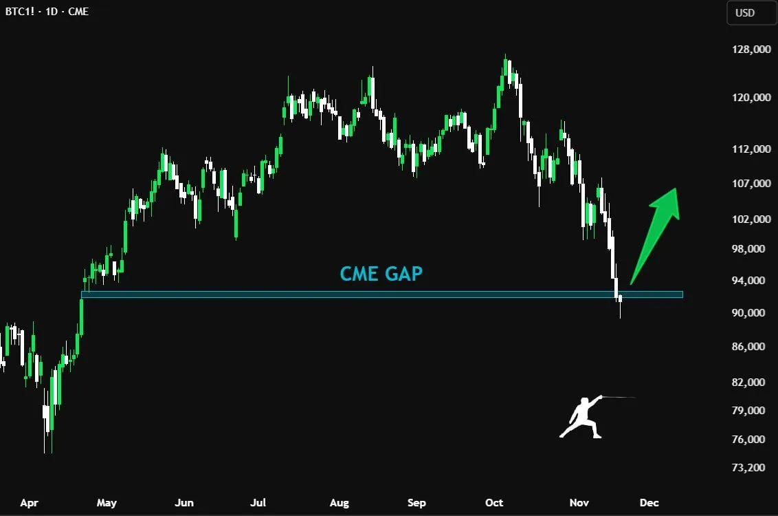 Bitcoin has closed a key CME futures gap after sliding to a support band around the mid-$90,000 zone. The daily chart for BTC1! on CME shows price dipping into the untraded area left behind during a prior upside move, then snapping back above the gap line.