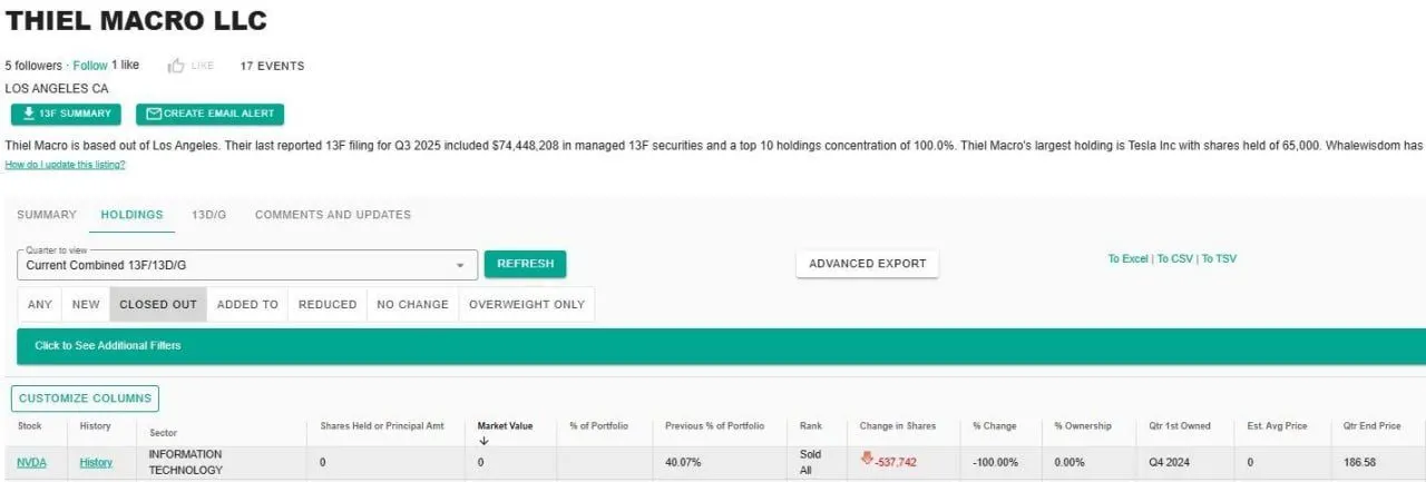 Meanwhile, Peter Thiel’s Thiel Macro LLC has exited its Nvidia position, according to portfolio data compiled from its latest 13F filing. The fund sold all 537,742 NVDA shares, cutting the holding from roughly 40% of its reported equity portfolio to zero and closing out a stake worth about $100 million at quarter-end prices.
