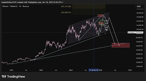 In an X post, Andrea shared an accompanying chart showing that Bitcoin could eventually crash to $60,000, with the crash expected sometime in mid-2026. However, before then, the crypto pundit predicted that BTC could still rally to new highs despite its recent crash below the psychological $100,000 level.