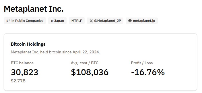 Metaplanet held approximately 30,823 Bitcoin worth roughly $3.3-3.5 billion at recent prices.