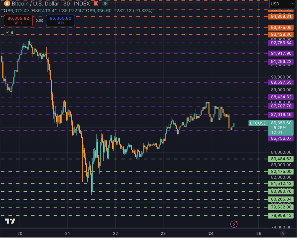 The level map, aligned with the chart below, places immediate support at $85.7k to $85k, then at $84k to $83.5k, with a secondary band at $82.5k to $81.5k, and a thicker shelf near $79k.