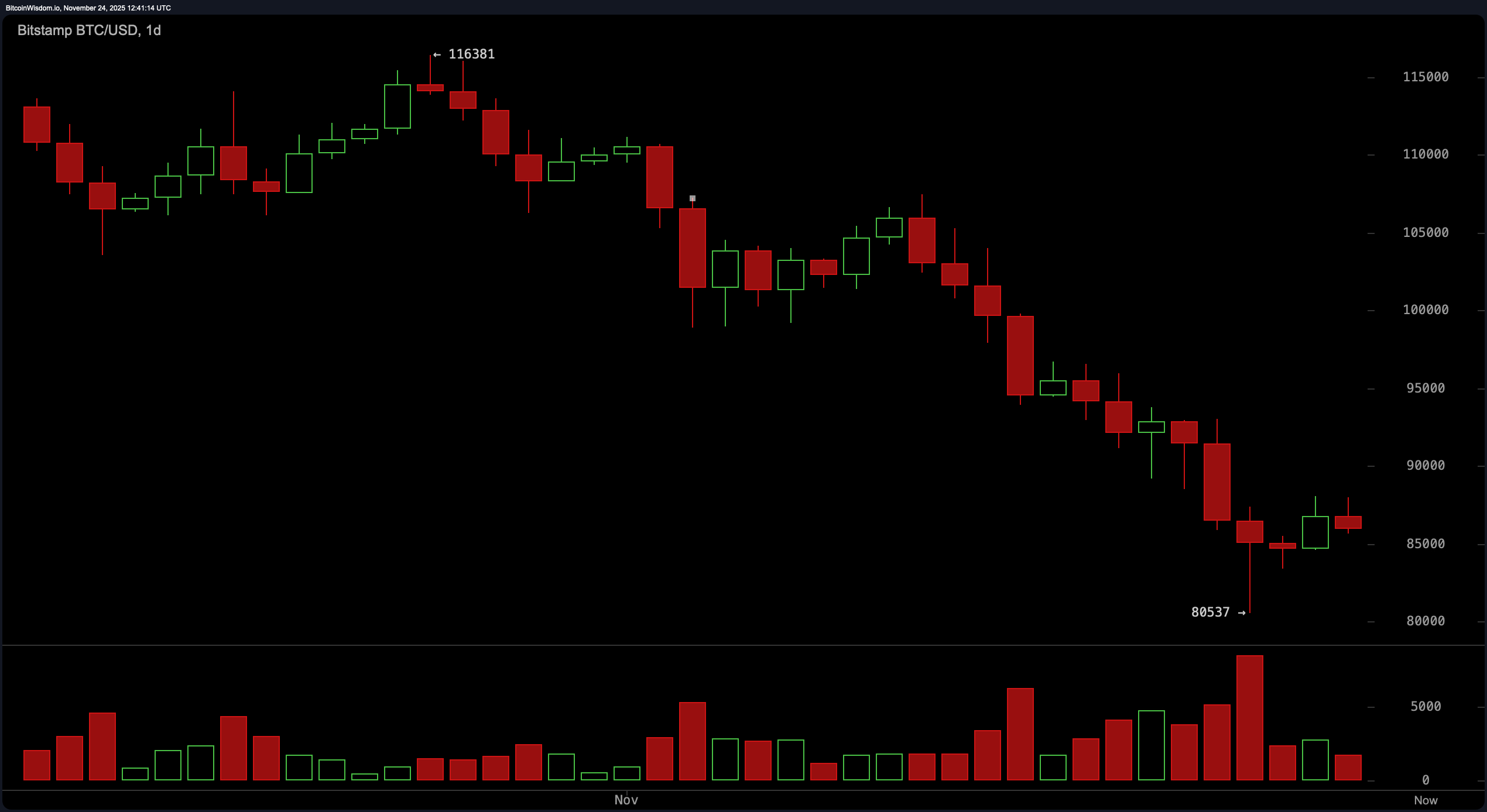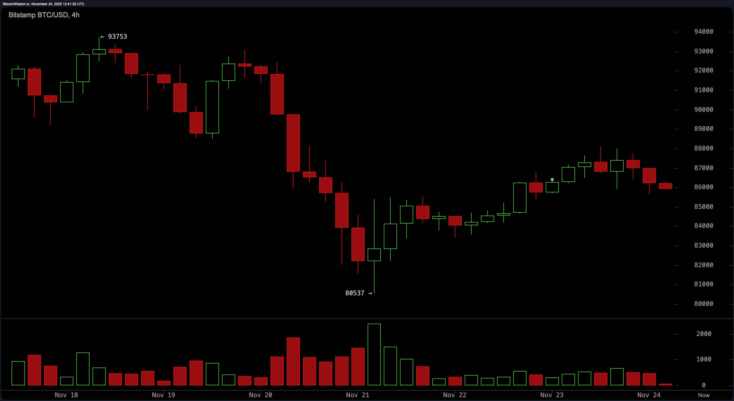 In the daily timeframe, bitcoin is riding a downward escalator, marked by lower highs and lower lows, all while volume spikes like it’s had one too many espressos. Despite this bearish macro structure, the asset has flirted with the $80,537–$85,000 level, showing signs of a short-term bottom.