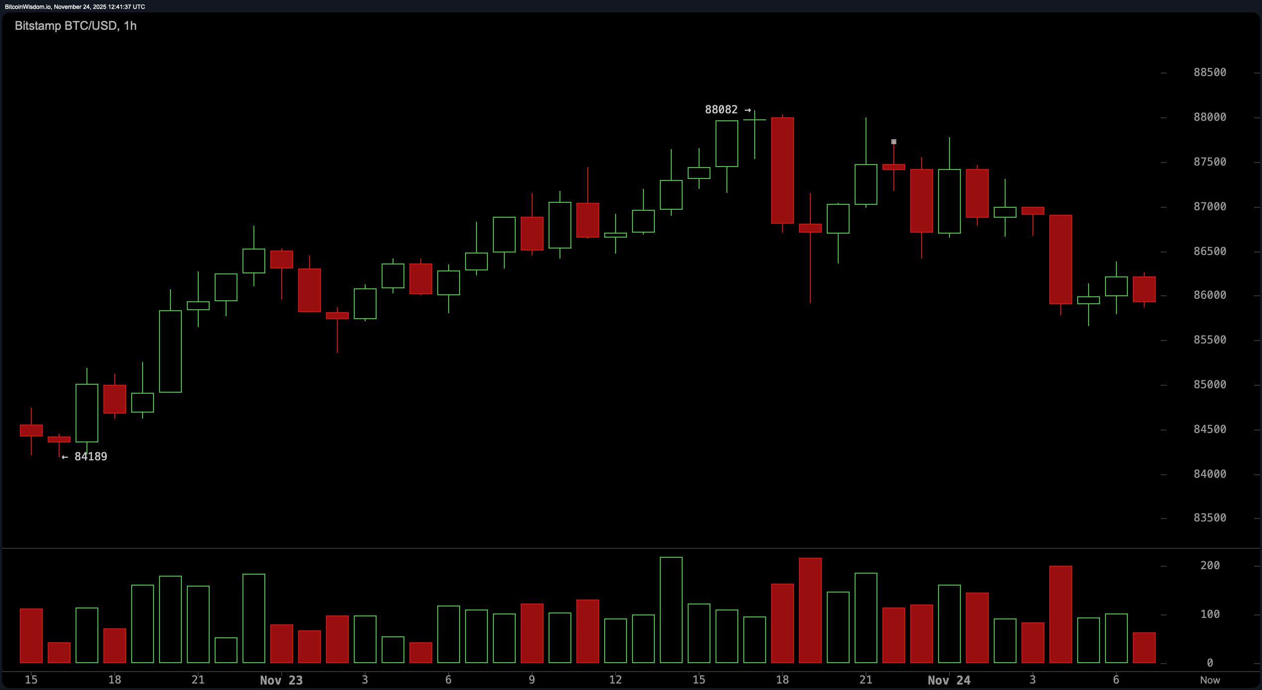The 1-hour chart paints a picture of micro-chaos and finesse, as bitcoin made a short climb from $84,000 to nearly $88,000 before softening into a consolidation phase. We’re currently witnessing a suspicious drop in volume—never a good sign when price keeps nudging up—which might hint at a bearish divergence brewing. A support break below $85,000 could trigger a quick retest of recent lows, while upward targets at $87,500–$88,000 remain viable for the nimble-fingered.
