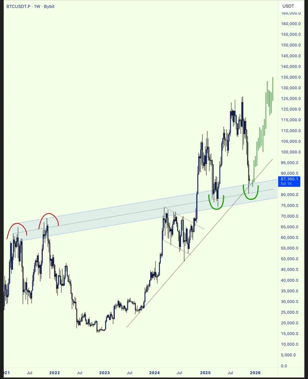 In the chart shared by trader Profit Blue, two green arcs mark recent lows near the lower boundary of that channel, outlining a potential double-bottom structure. The pattern appears after a sharp drawdown from the 130,000 area, yet weekly closes remain inside the channel, signaling that the broader uptrend is still in place for now.