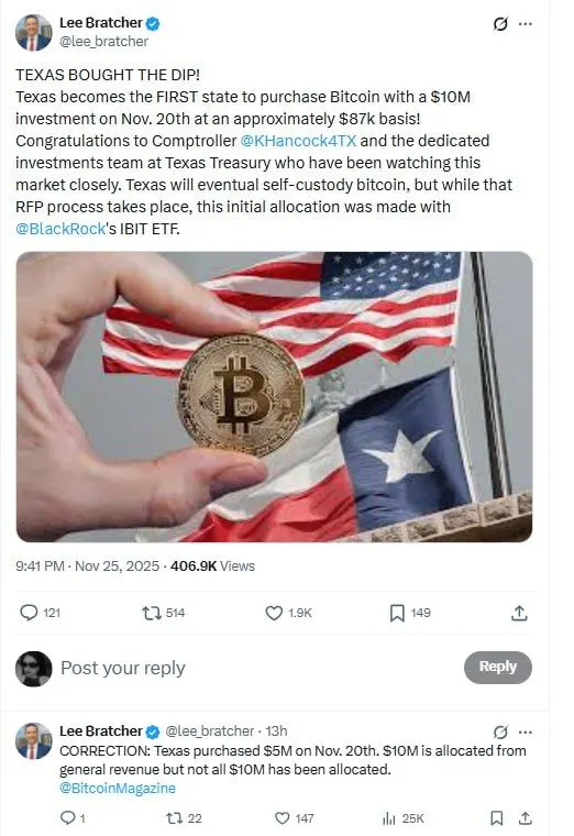 Texas Bitcoin Purchase Symbolic. Source: Lee Bratcher via X