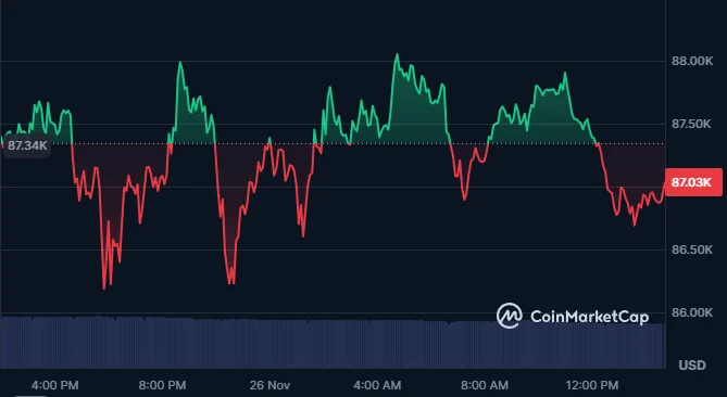 Bitcoin traded at $87,036 at the time of Metaplanet's latest loan draw, down 0.34% on the day. The cryptocurrency has declined more than 24% over the past month, testing investor resolve across the market.