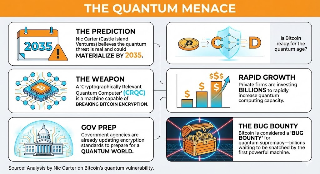 Nic Carter warns that a quantum computer capable of breaking Bitcoin’s encryption could emerge by 2035, posing a significant threat to its security. -