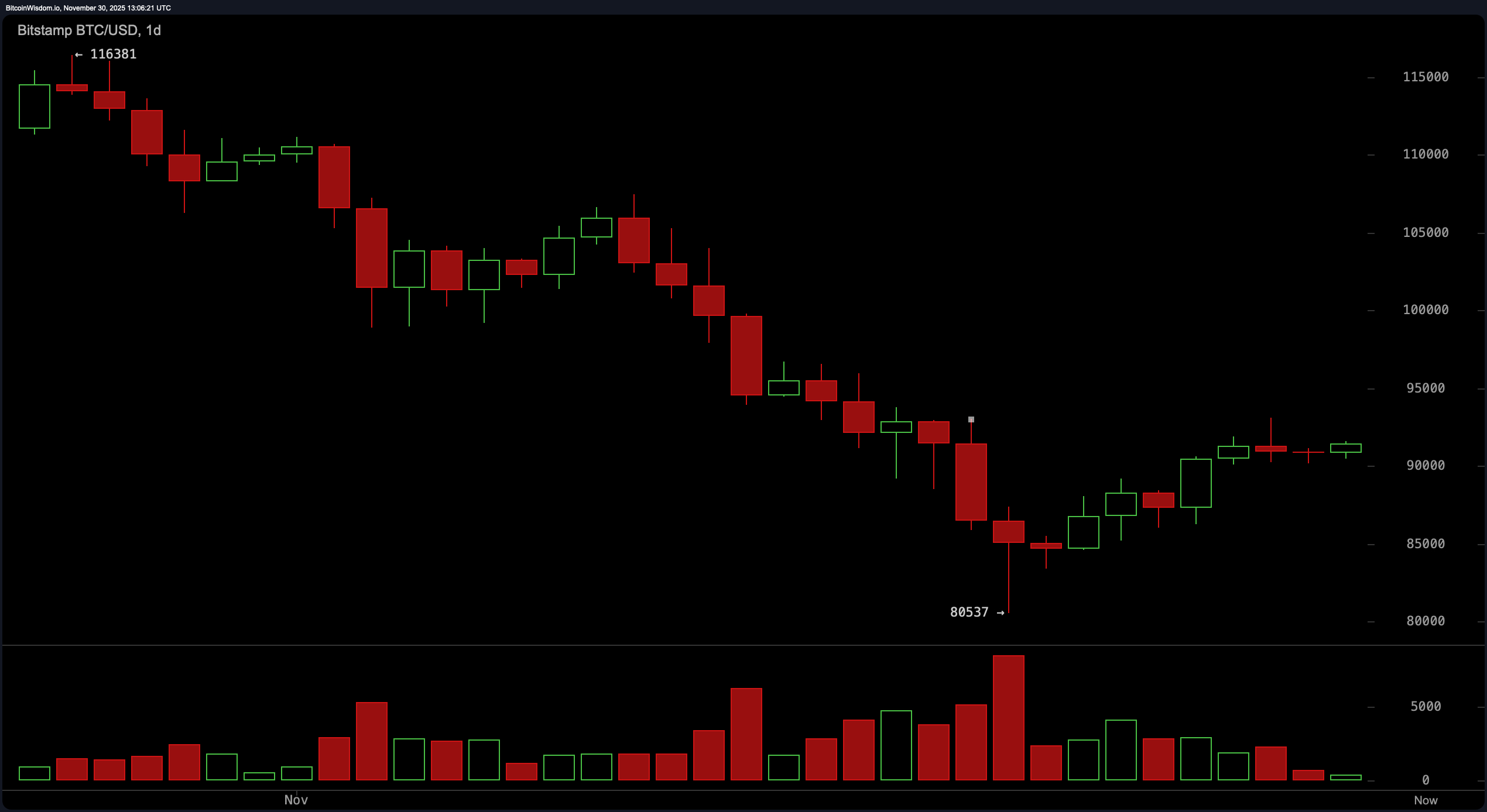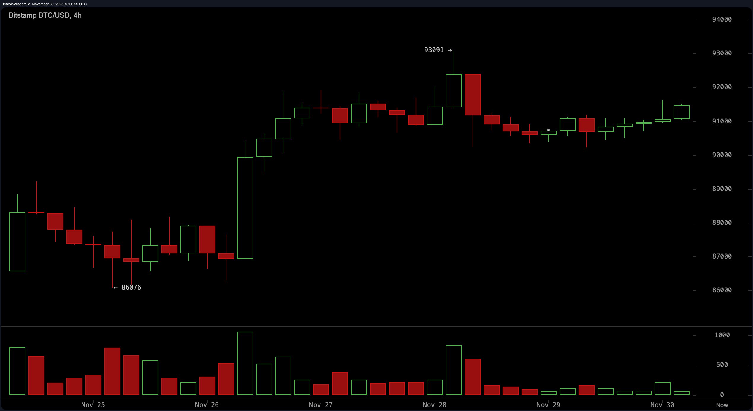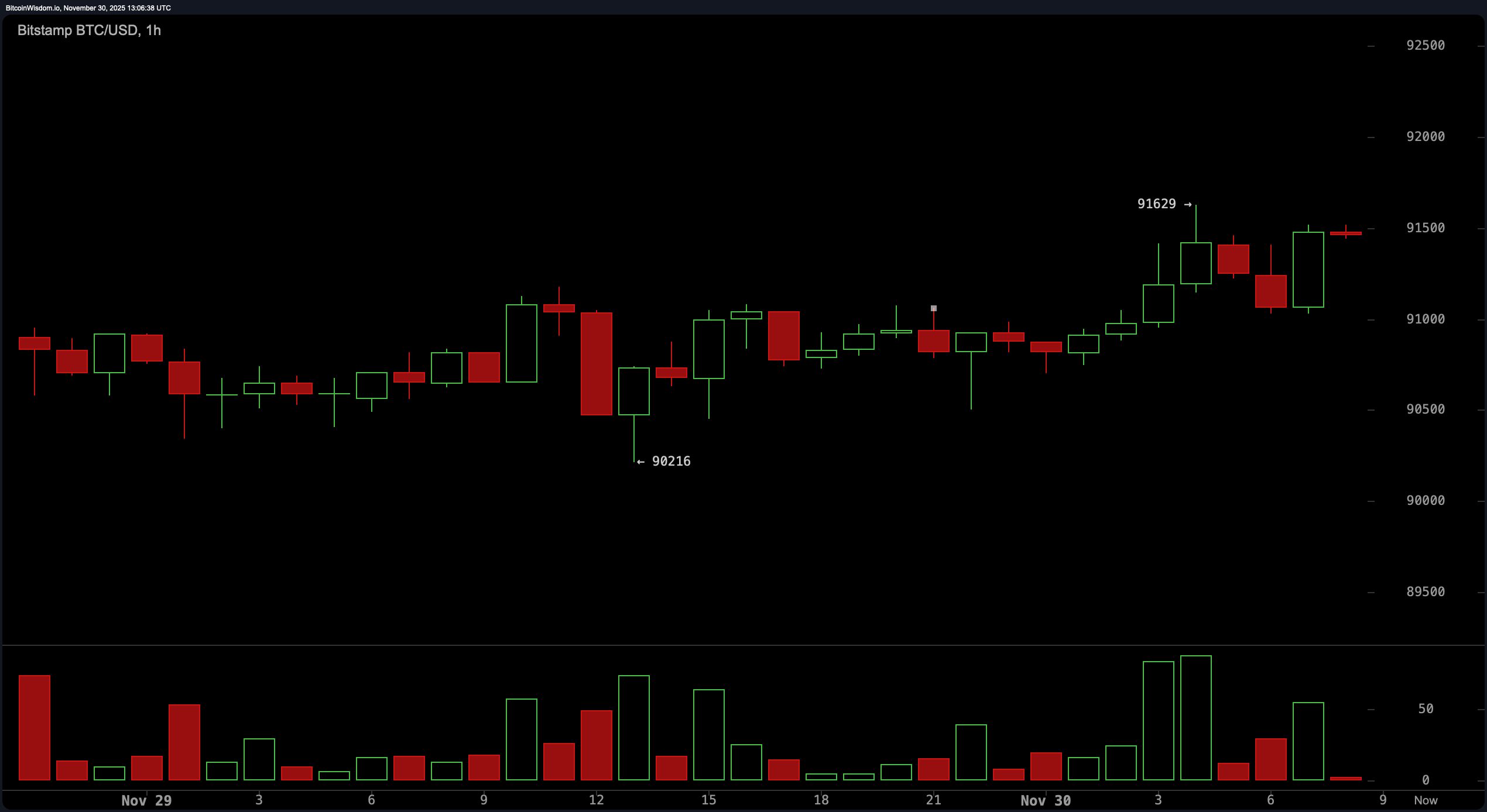 On the 1-hour chart, bitcoin’s rhythm reveals a modestly bullish heartbeat—think cautious optimism rather than euphoric surge. A key pivot formed around $90,800 to $91,200 after a higher low stamped itself at $90,216. Buyers nudged the price upward to $91,629, only to face a wall of hesitation just shy of $92,000. This zone now acts as a soft ceiling with volume tapering—proof that traders are keeping one eye on the exits and the other on momentum’s mood swings.