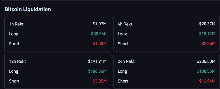 The 24-hour data reflects similar pressure, showing $205.50 million in total liquidations, with $188.55 million wiped from long positions versus $16.94 million from shorts. The imbalance across all timeframes signals that the market’s pullback primarily punished overleveraged bullish positioning.