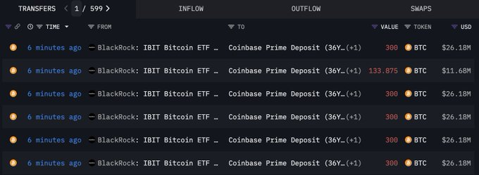Data from the IBIT Bitcoin ETF wallet shows multiple rapid-fire transfers flowing into Coinbase Prime deposit accounts.