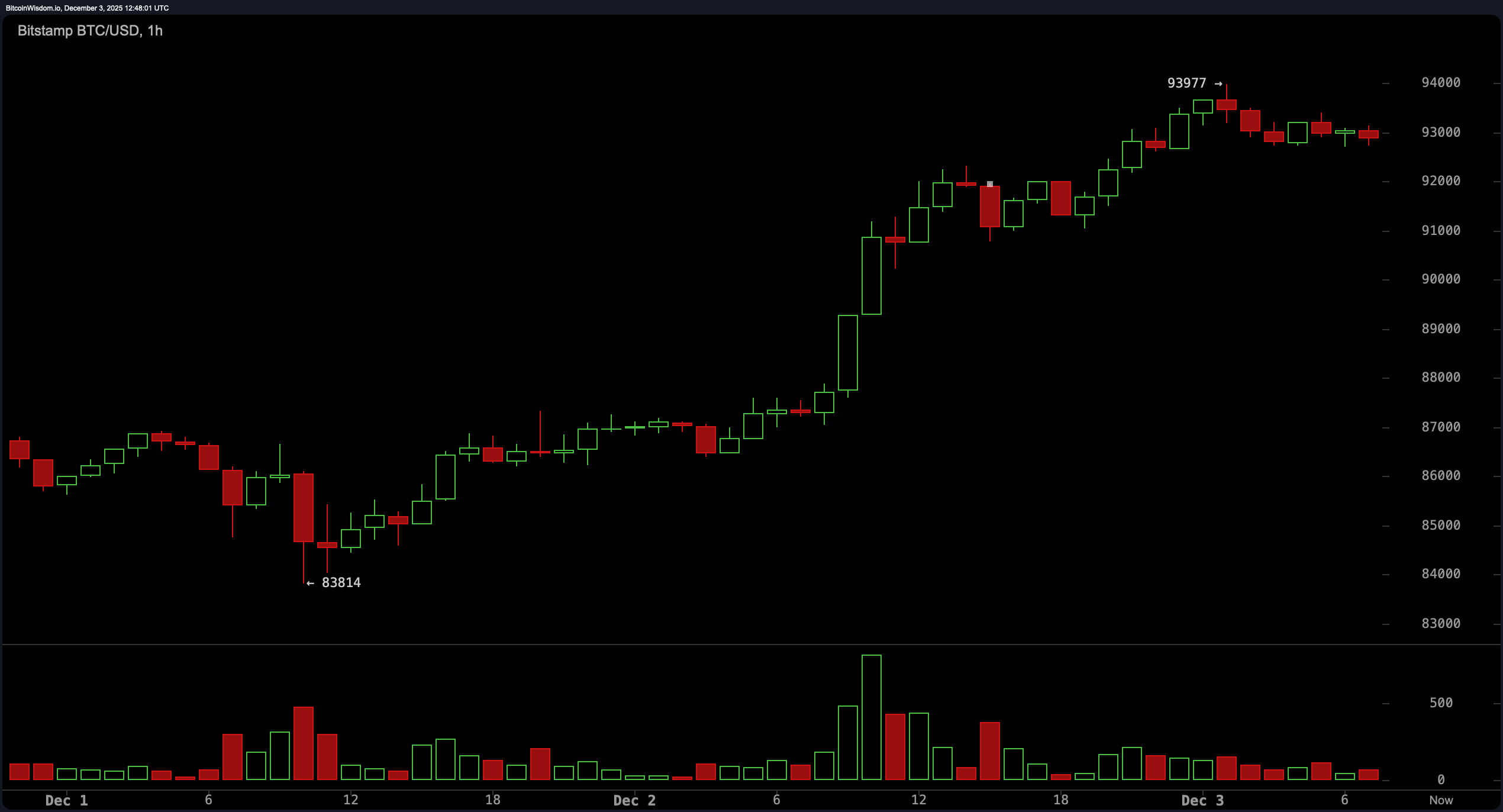 On the 1-hour chart, the tempo remains bullish but measured. The price is coiling beneath its recent high, moving in a narrow band and likely gearing up for a micro-breakout or a tactical pullback. Momentum is waning slightly, evidenced by tapering volume and a relative strength index (RSI) that’s likely tiptoeing into overbought territory. A move above $94,000 with volume follow-through could ignite short-term upside action, while any breach below $91,500 would spoil the party for scalpers banking on this uptrend’s continuation.