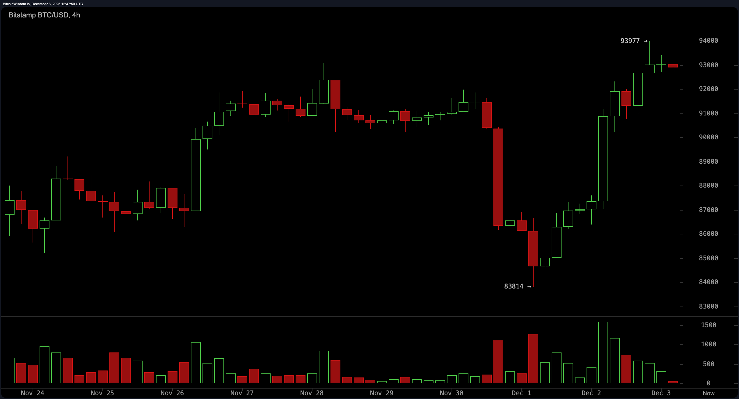 Moving down to the 4-hour chart, bitcoin is catching its breath after a sharp surge from $83,814 to $93,977. The consolidation now seen just below $94,000 suggests a market taking stock of itself — neither overextended nor eager to charge ahead without reinforcements. The falling volume is telling, hinting at either a healthy pause or the beginning of a more meaningful retracement. A push above $94,000 with volume confirmation could unlock continuation potential, while a slip below $88,500 may be the cue that momentum is giving up the ghost — at least for now.
