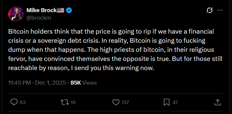 “ Bitcoin holders think that the price is going to rip if we have a financial crisis,” Brock said. “In reality, Bitcoin is going to f*cking dump when that happens. The high priests of bitcoin, in their religious fervor, have convinced themselves the opposite is true. But for those still reachable by reason, I send you this warning now.”