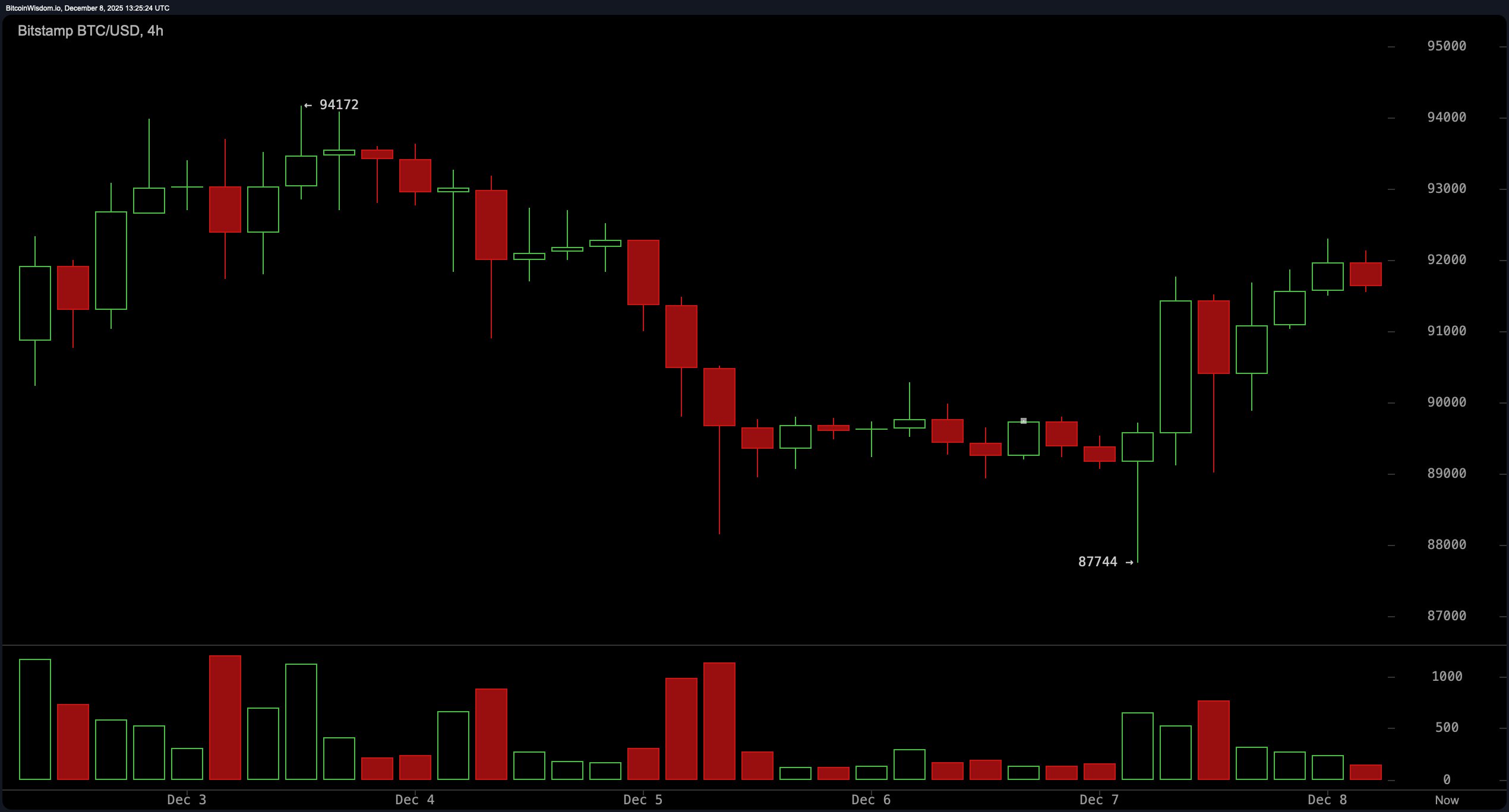 Bitcoin’s recent bounce from $87,744 to just over $92,000 shows a textbook recovery structure on the 4-hour chart, but the fun seems to stall near resistance. Topping wicks and seller rejections near $92,000 hint that this dance isn’t over, and bitcoin might still be waiting for a true breakout partner.