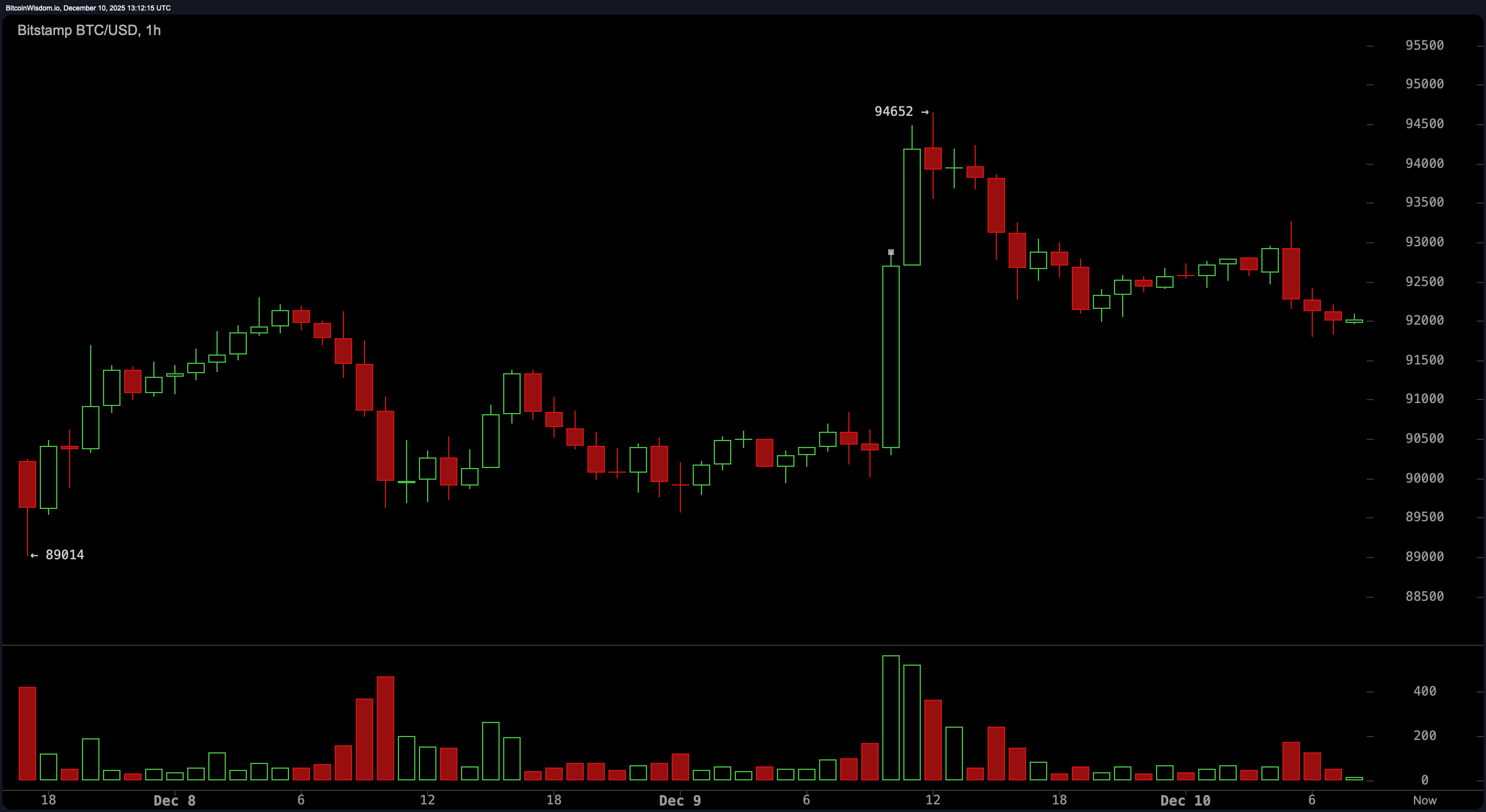 On Wednesday, the 1-hour chart paints a tale of exuberance and fatigue. After a rocket-fueled rally that peaked at $94,652, bitcoin’s price has cooled off, consolidating between $92,000 and $93,000. Volume has taken a post-party nap—once euphoric, now subdued—hinting that the crowd might be catching its breath.