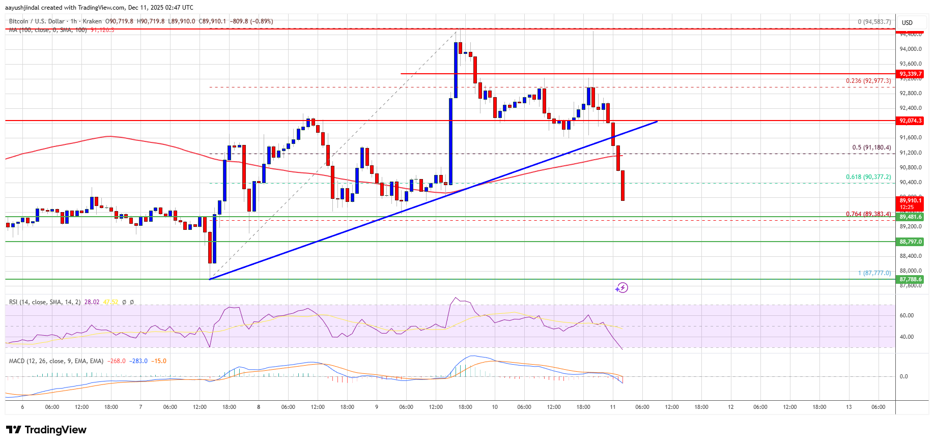 There was a clear move below the 50% Fib retracement level of the upward move from the $87,777 swing low to the $94,583 high. Besides, there was a break below a bullish trend line with support at $91,600 on the hourly chart of the BTC/USD pair.