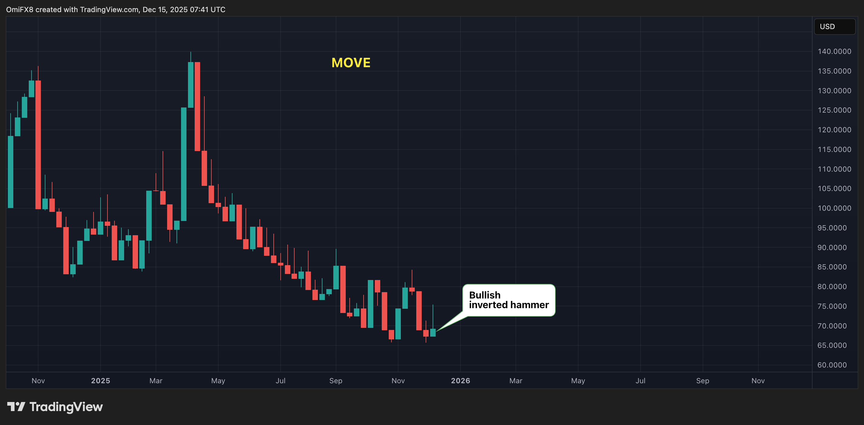 The MOVE index put in an inverted hammer candle last week. This candlestick pattern, appearing after a prolonged downtrend as in MOVE's case, is taken to represent an early sign of bullish revival.