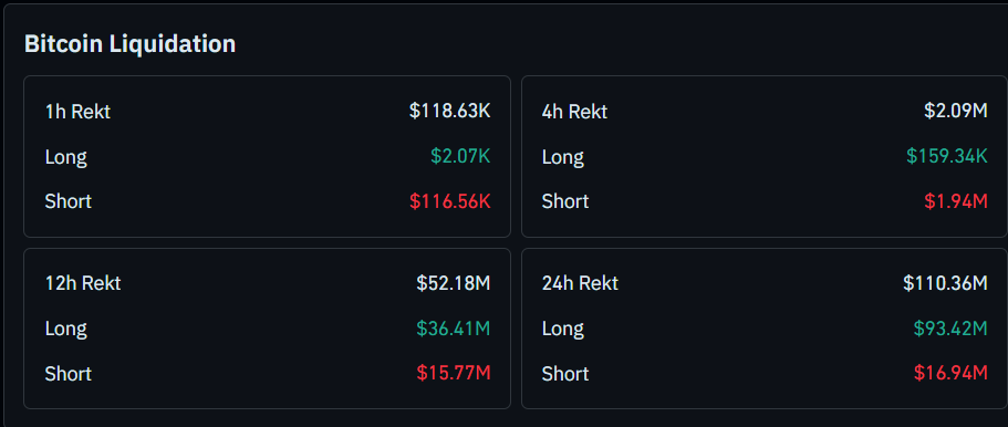 Extending to the 24-hour window, the wreckage amplifies to $110.36 million overall, dominated by $93.42 million in long liquidations against a comparatively modest $16.94 million for shorts. This has possibly contributed to the observed volatility and hinting at bearish dominance in the session.