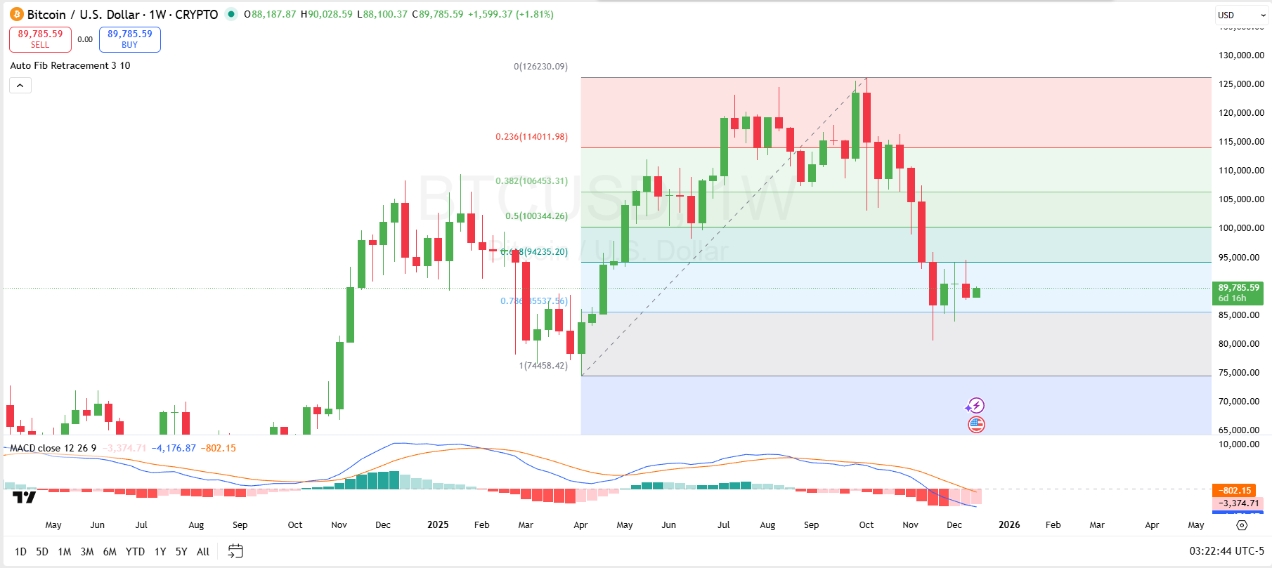 Diving deeper into Bitcoin’s price action through a technical lens, the weekly chart reveals Fibonacci levels serving as pivotal guides for support and resistance. Drawn from the October peak near $126,030 to a swing low around $74,458, these levels highlight key zones.