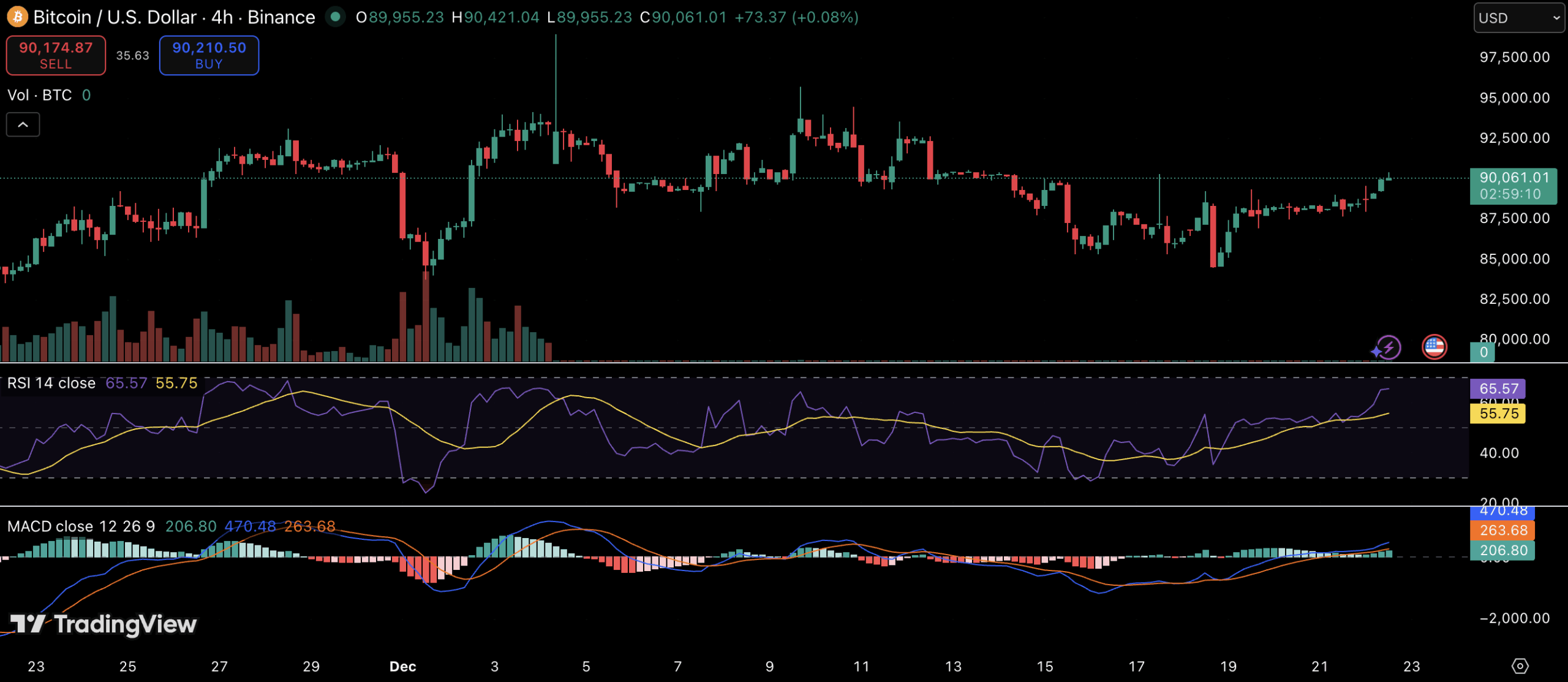 The announcement comes as Bitcoin trades in a relatively tight range near the $90,000 area on the 4-hour chart. Momentum indicators show modest bullish pressure building, with RSI holding above neutral territory and MACD trending upward, signaling improving short-term sentiment.