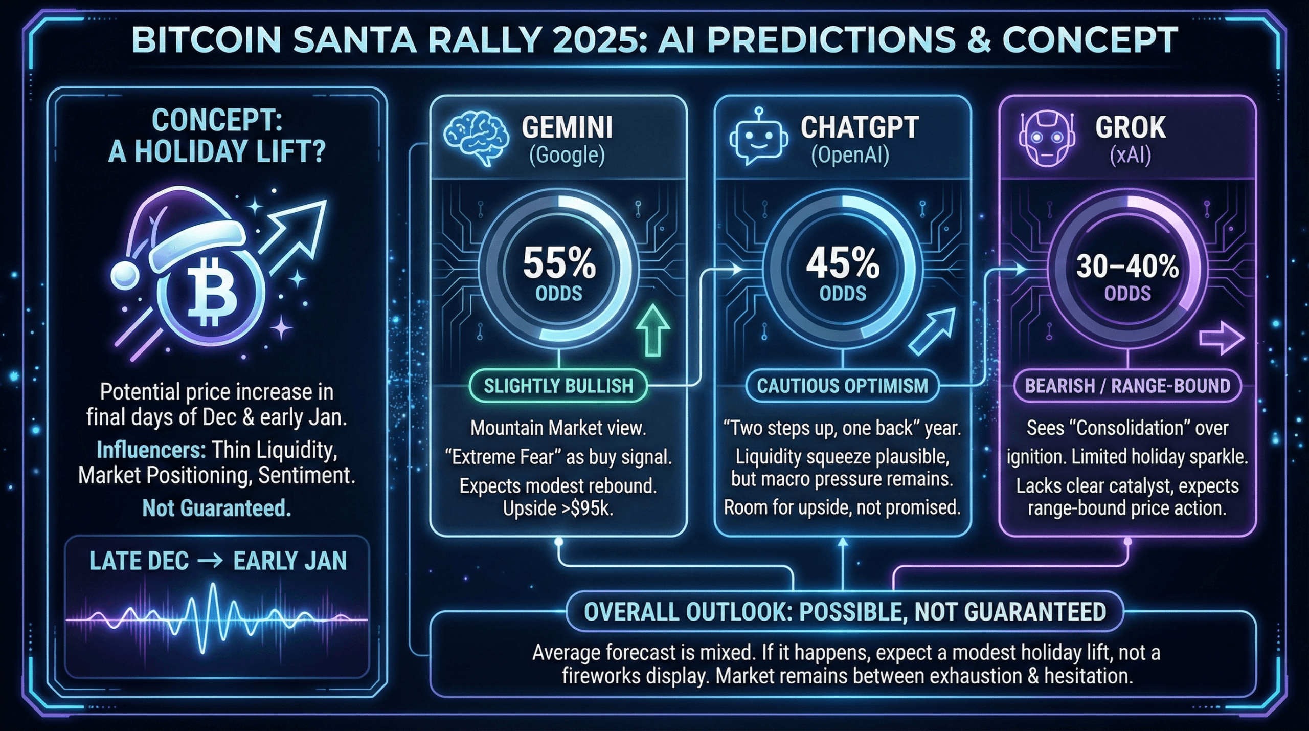 Bitcoin is drifting just below $90,000 heading into year-end, and three major AI models now put hard odds on whether a long-awaited Santa Rally can still show up in 2025—or stay stuck in the workshop.