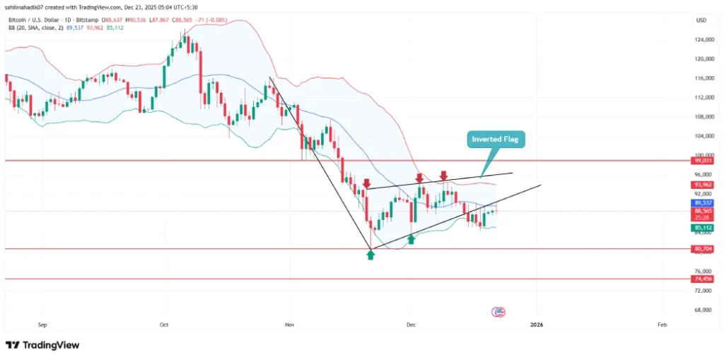 Since last weekend, the Bitcoin price showed low volatility trading below $90,000. As mentioned by CryptoNewsZ earlier, the overhead region acts as flipped resistance after the recent breakdown from an inverted flag pattern.