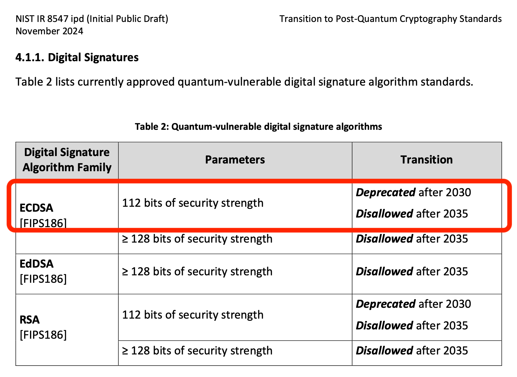 First, Carter asserts that multiple governments are accelerating their timelines for quantum breakthroughs. He notes draft guidance from the US National Institute of Standards and Technology which recommends deprecating quantum-vulnerable cryptography like ECC256 by the year 2030.
