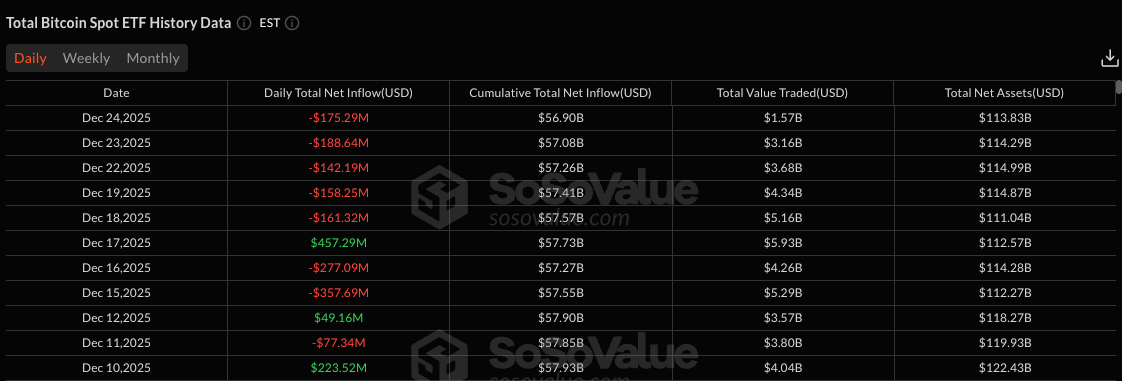 First, year-end liquidity is thin. Holiday trading volumes have amplified volatility while limiting conviction-driven moves. Second, institutional flows have turned negative — US spot Bitcoin ETFs have seen five consecutive days of net outflows totaling over $825 million, according to SoSoValue data.