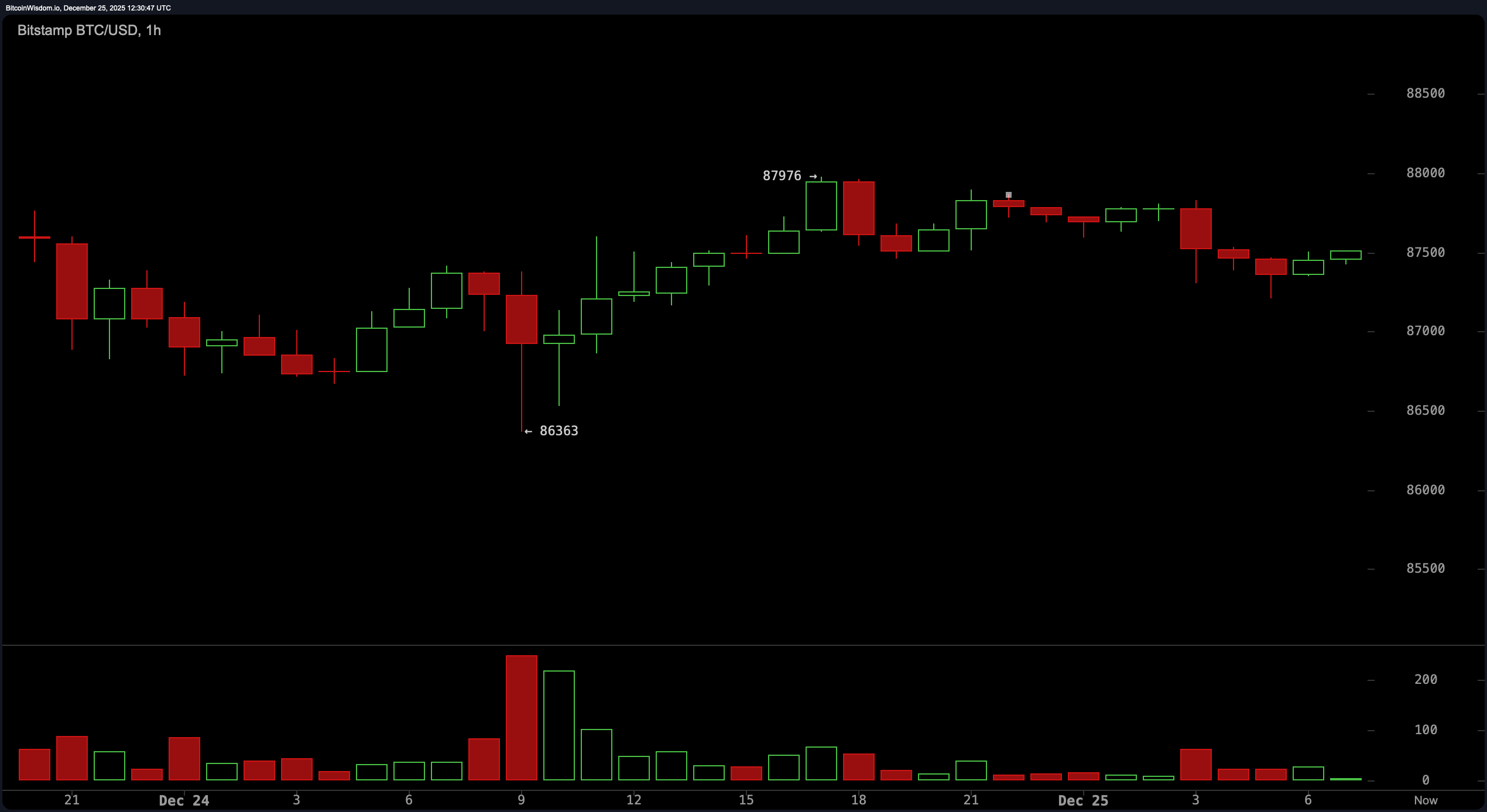 Zooming into the 1-hour chart, bitcoin’s microtrend is swaying between bearish and neutral. A recent bounce from $86,363 to a local top at $87,976 has fizzled into a narrow range between $87,300 and $87,800. With volume thinner than holiday eggnog, short-term participants appear exhausted, leaving bitcoin in a holding pattern. A clear move above $88,000 could hint at upside ambition, while a drop below $87,000 might unravel support quicker than wrapping paper at dawn.