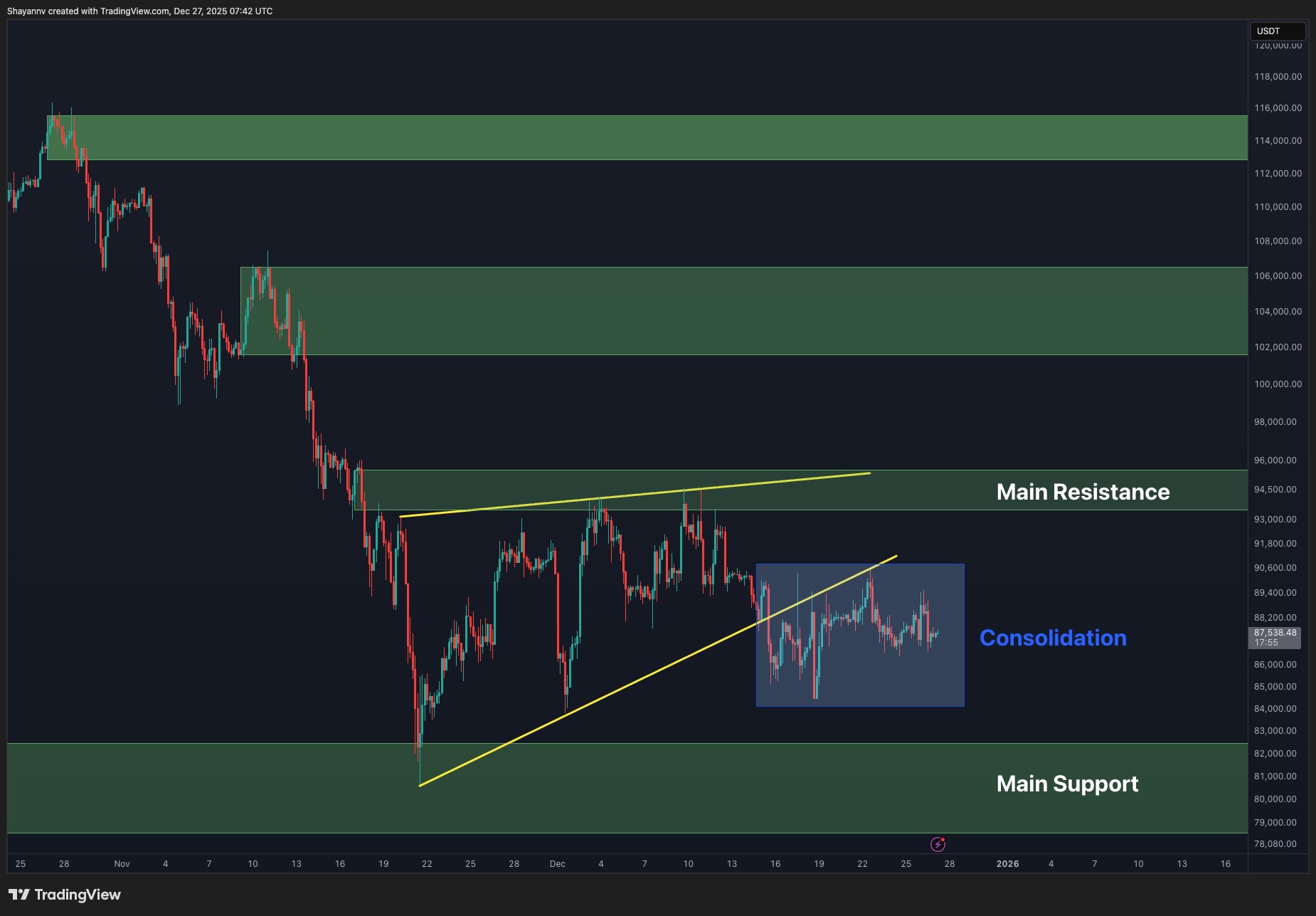 Recent upside attempts have been rejected quickly, indicating that supply remains active on minor rallies. At the same time, downside pressure has slowed near the $85K–$86K region, where short-term demand continues to absorb sell orders. This price behavior suggests a range-bound environment, with liquidity being built on both sides before an expansion. A clean breakdown below the consolidation would open the path toward the $82K demand zone, while a sustained reclaim above the short-term resistance would be required to shift the intraday bias to the bullish side.
