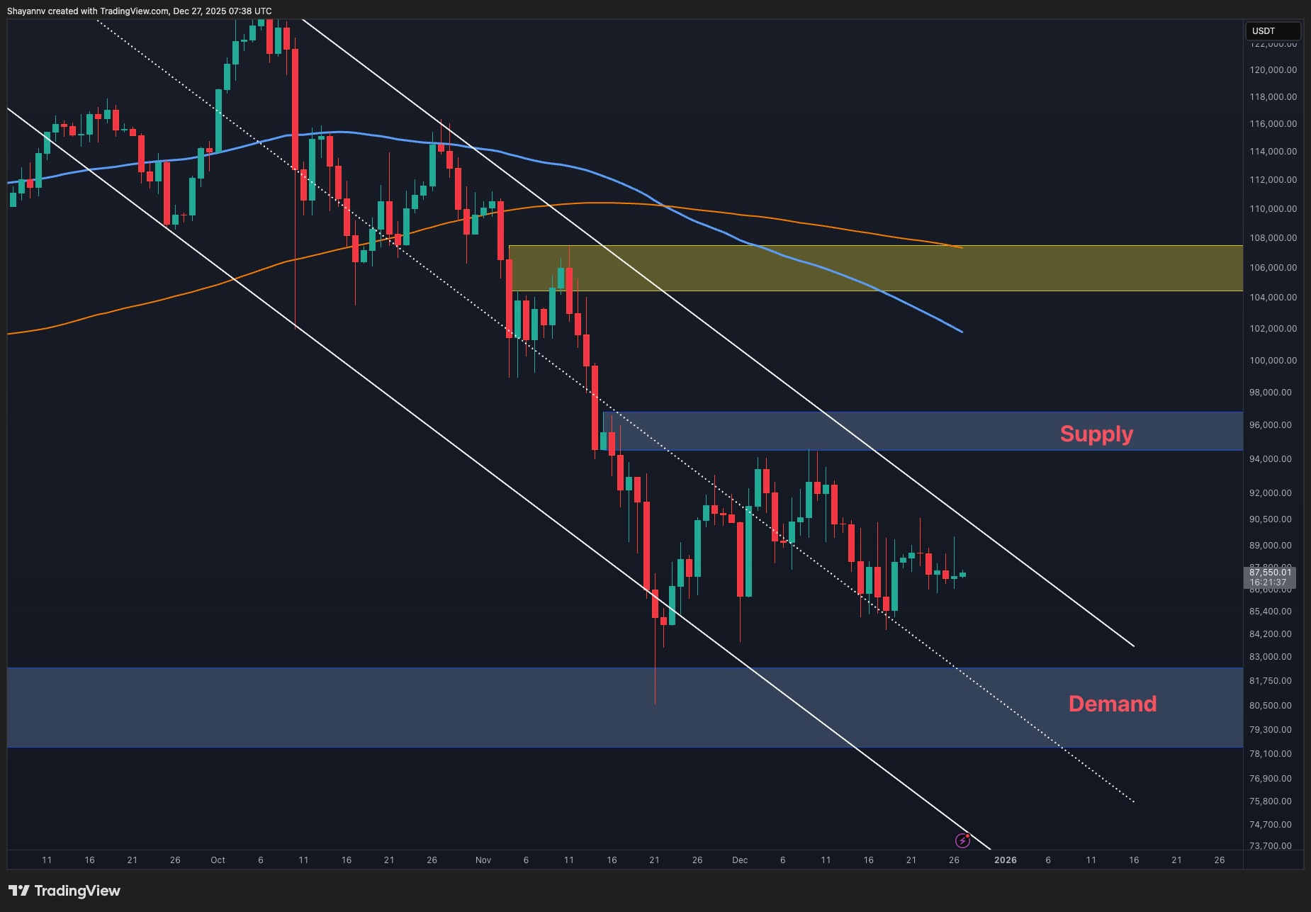 On the daily timeframe, Bitcoin is still respecting a broader descending structure following the recent impulsive selloff. The price is currently confined between a well-defined demand zone in the $82K–$80K range and a major resistance band near $95K–$96K. The repeated failure to reclaim the mid-range resistance highlights persistent sell-side control, while the lower highs structure confirms that bullish momentum remains weak.