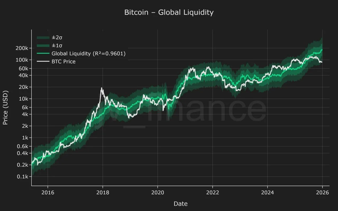The chart spans data from 2015 through projections into 2026, placing the current setup alongside major turning points from earlier cycles. While the model does not predict timing, it frames the current price level as one of the more compressed relative to liquidity seen across Bitcoin’s history.