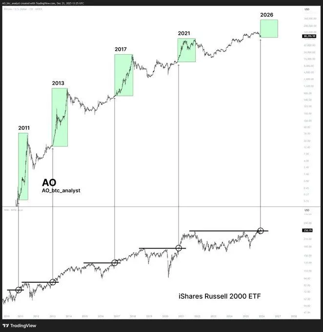 AO wrote, “Every time the Russell 2000 breaks out, a Bitcoin bull run follows,” then added, “The Russell has just broken out.” The post did not include a specific Bitcoin price target or a timeframe beyond the historical comparison shown on the chart.