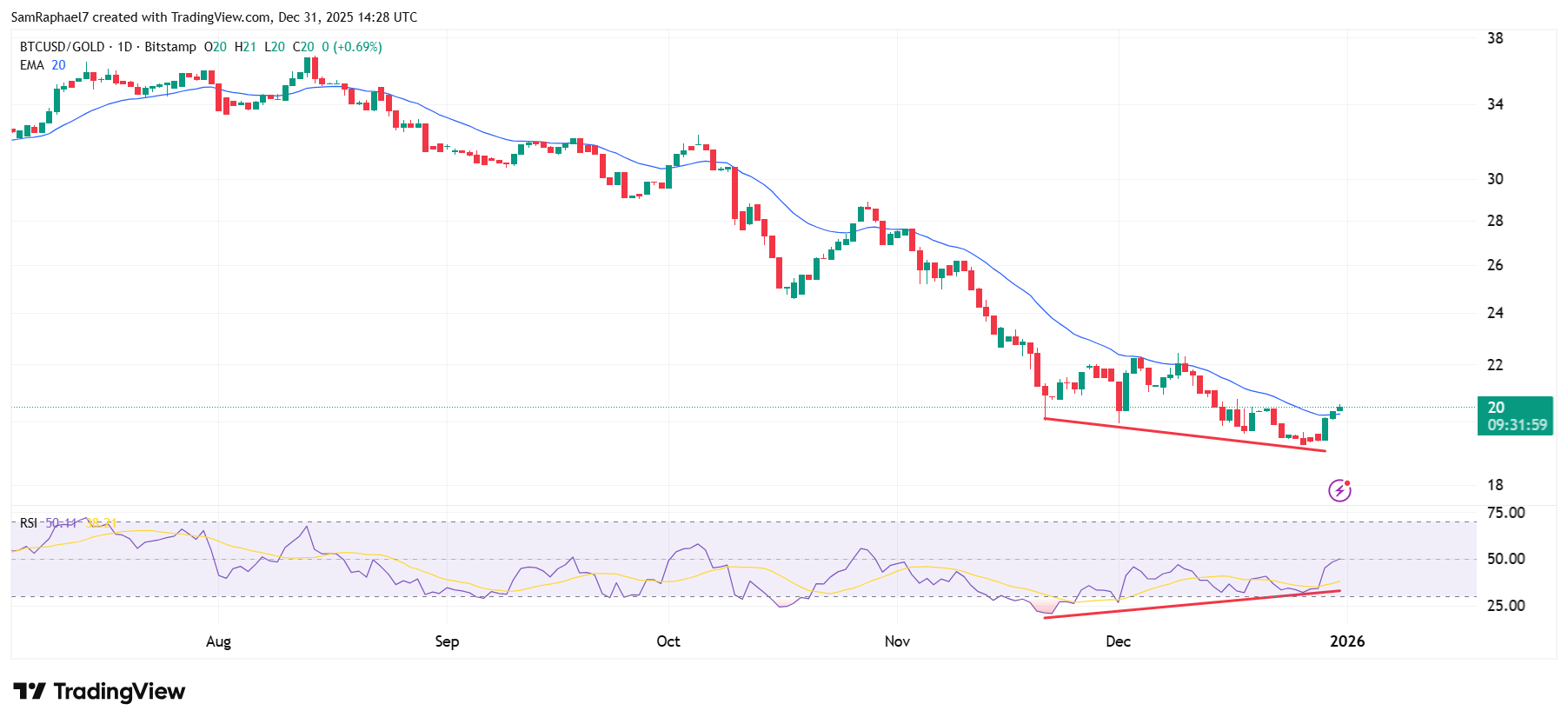 Interestingly, another lower low of 19 emerged on Dec. 26, but the RSI hit a higher low of 32.21. If the proper conditions align, this pattern may represent signs of a potential bullish reversal for Bitcoin, which has continued to underperform against gold this quarter.