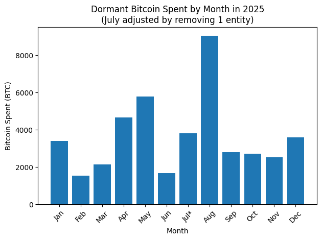 - Which month had the highest dormant bitcoin spending?July recorded the highest total, with 83,865.75 BTC spent.