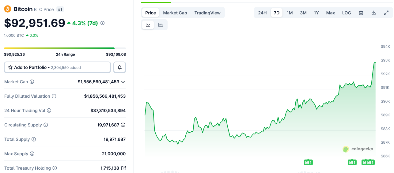 Bitcoin (BTC) has risen 3.35% from $89,990 to $93,000 since the military operation in Venezuela, CoinGecko data shows.