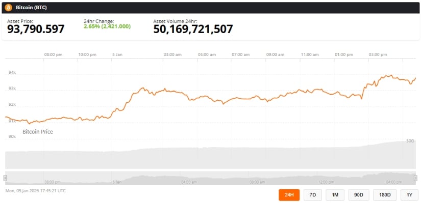 Bitcoin was trading at around 93,790, up 2.65% in the last 24 hours at press time. Source: Bitcoin price via Brave New Coin