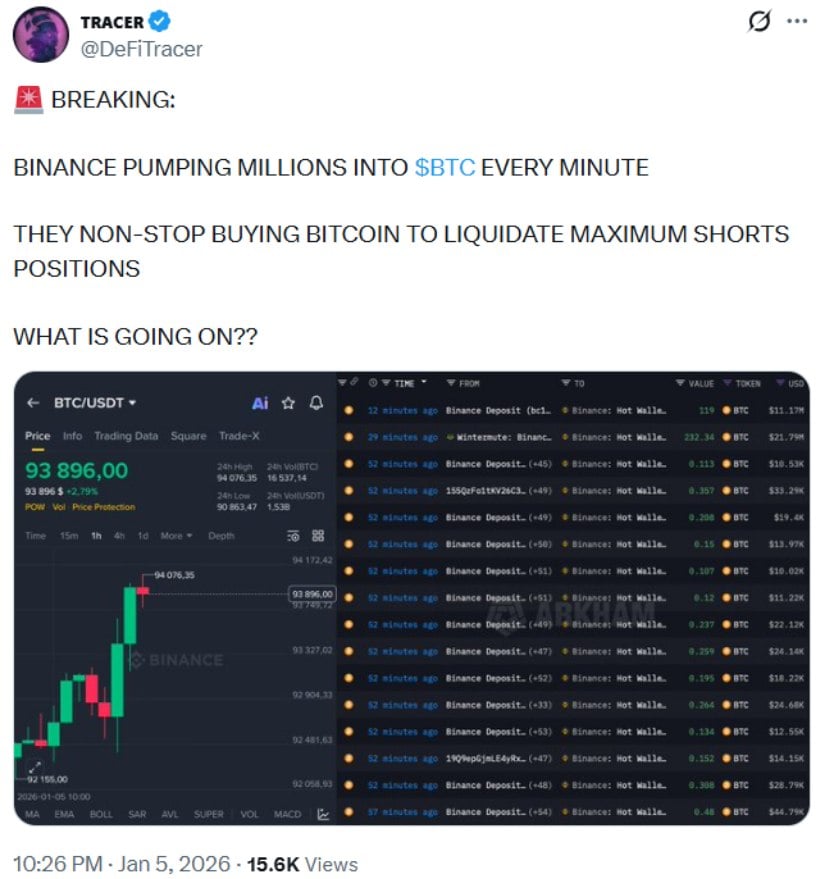 Binance sees massive BTC inflows as short-liquidation buying drives market momentum. Source: @DeFiTracer via X