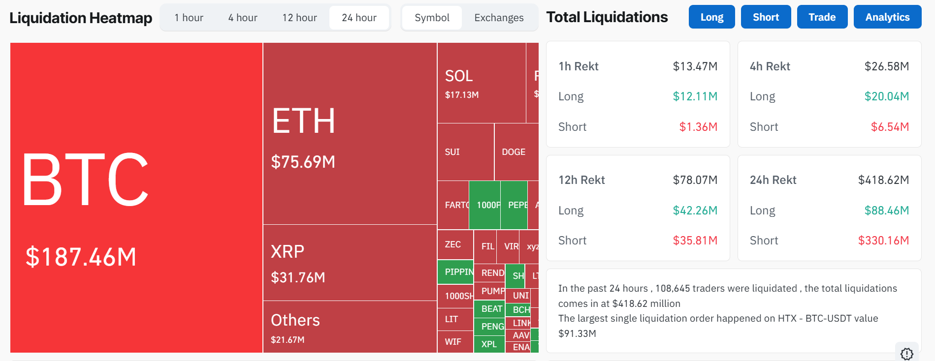 Data from CoinGlass shows that $418.62 million in futures positions were liquidated over the past 24 hours. Of this total, short positions accounted for $330.16 million, while long liquidations reached $88.46 million.