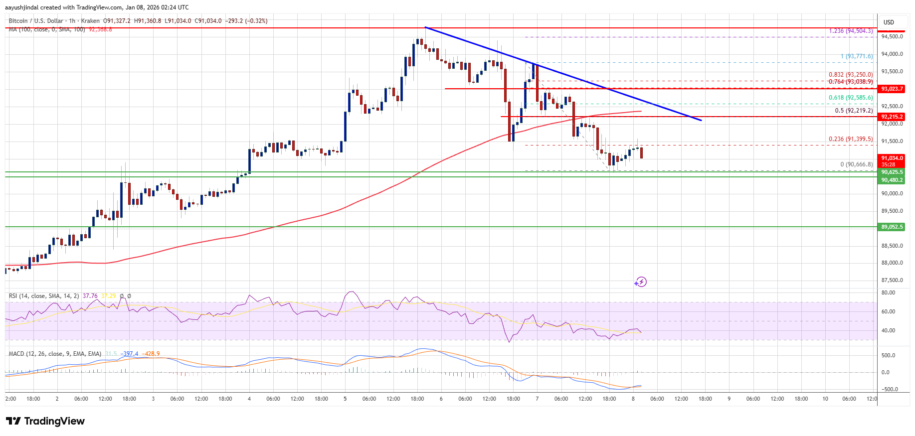 - The price is trading below $92,000 and the 100 hourly Simple moving average.