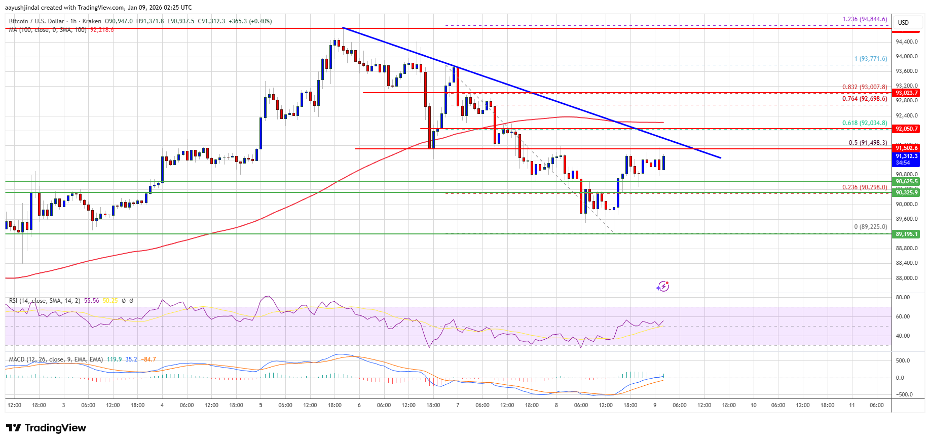 - The price is trading below $91,500 and the 100 hourly Simple moving average.