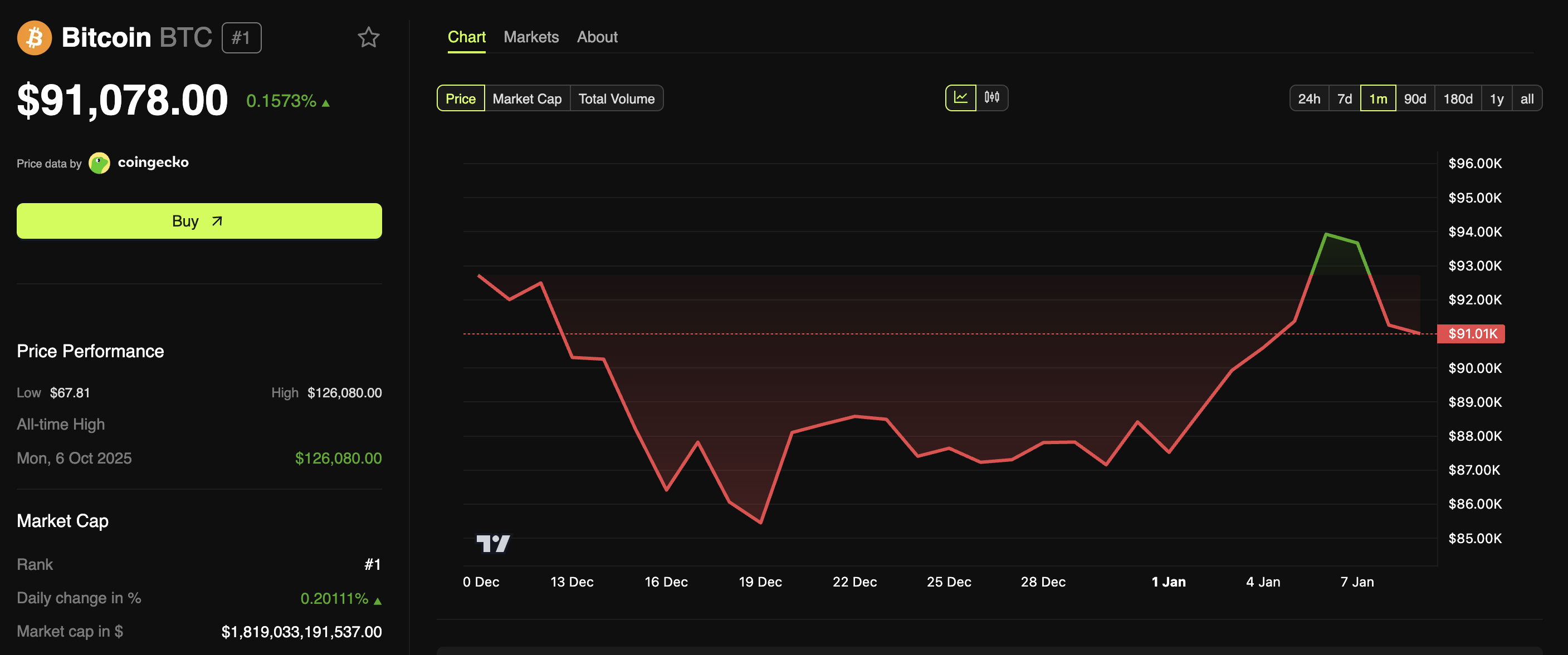 On January 8, BTC briefly dropped below $90,000, reaching a low of $89,253 on Binance. At the time of writing, Bitcoin was trading at $91,078, representing a 0.157% increase over the past day.