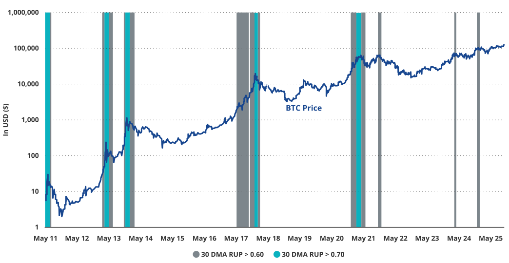 When the 30-day moving average of Relative Unrealized Profit exceeds 0.70, tactical cycle tops usually follow, according to the analysis. The metric stood at 0.43 at the end of 2025, a level VanEck said historically preceded strong returns over the next one to two years.