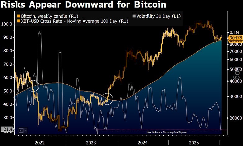 Bitcoin is coiling inside a tightening range as volatility sinks to historic lows, raising the risk of a decisive repricing that could shape crypto markets in 2026, according to Bloomberg Intelligence strategist Mike McGlone.