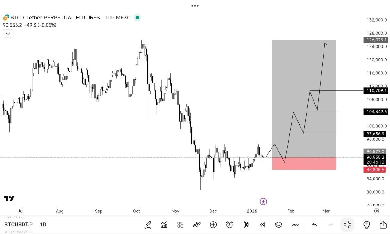 A TradingView chart he shared showed BTC/USDT perpetual futures near $90,555 on the daily timeframe. The chart marked a downside risk zone that extended into the high $80,000s, with a lower boundary around $86,808.