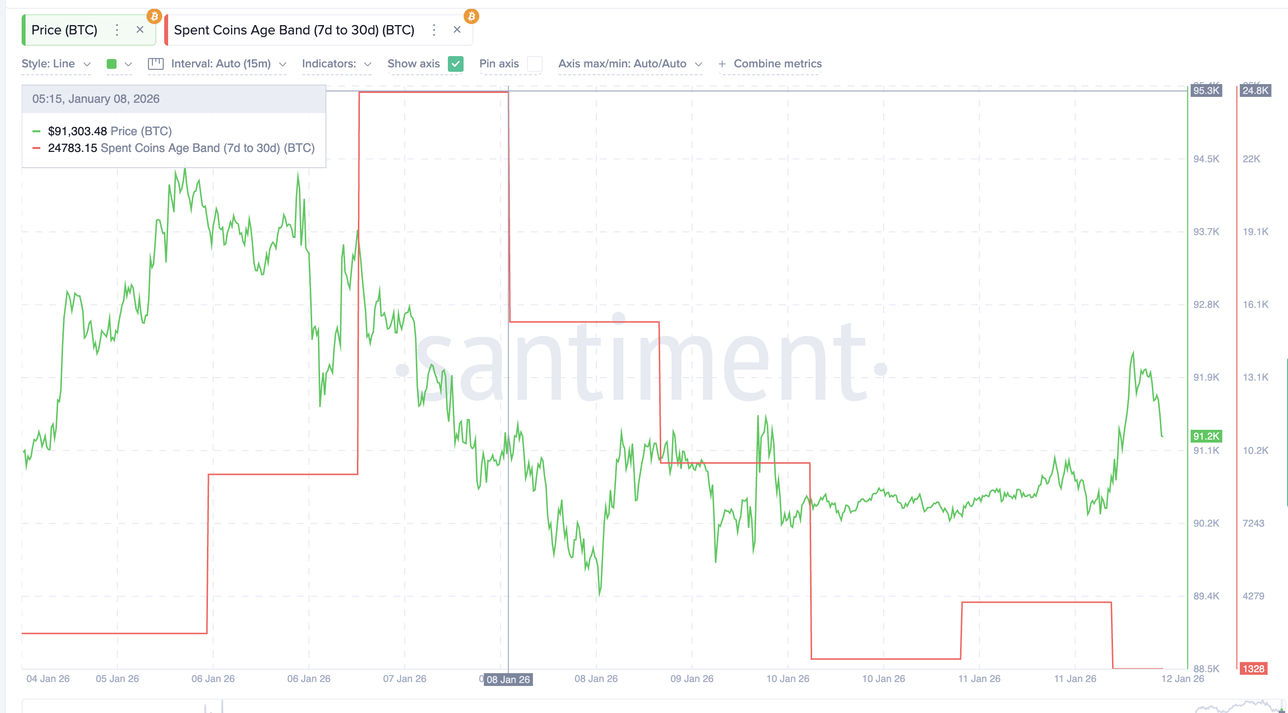 Short-term selling pressure has collapsed. Spent Coins Age Band data, which highlights cohort-specific coin activity, for the 7-day to 30-day group shows activity falling sharply, from around 24,800 BTC to just 1,328 BTC, a 95% decline since January 8. This means recent buyers are not rushing to sell into the bounce.