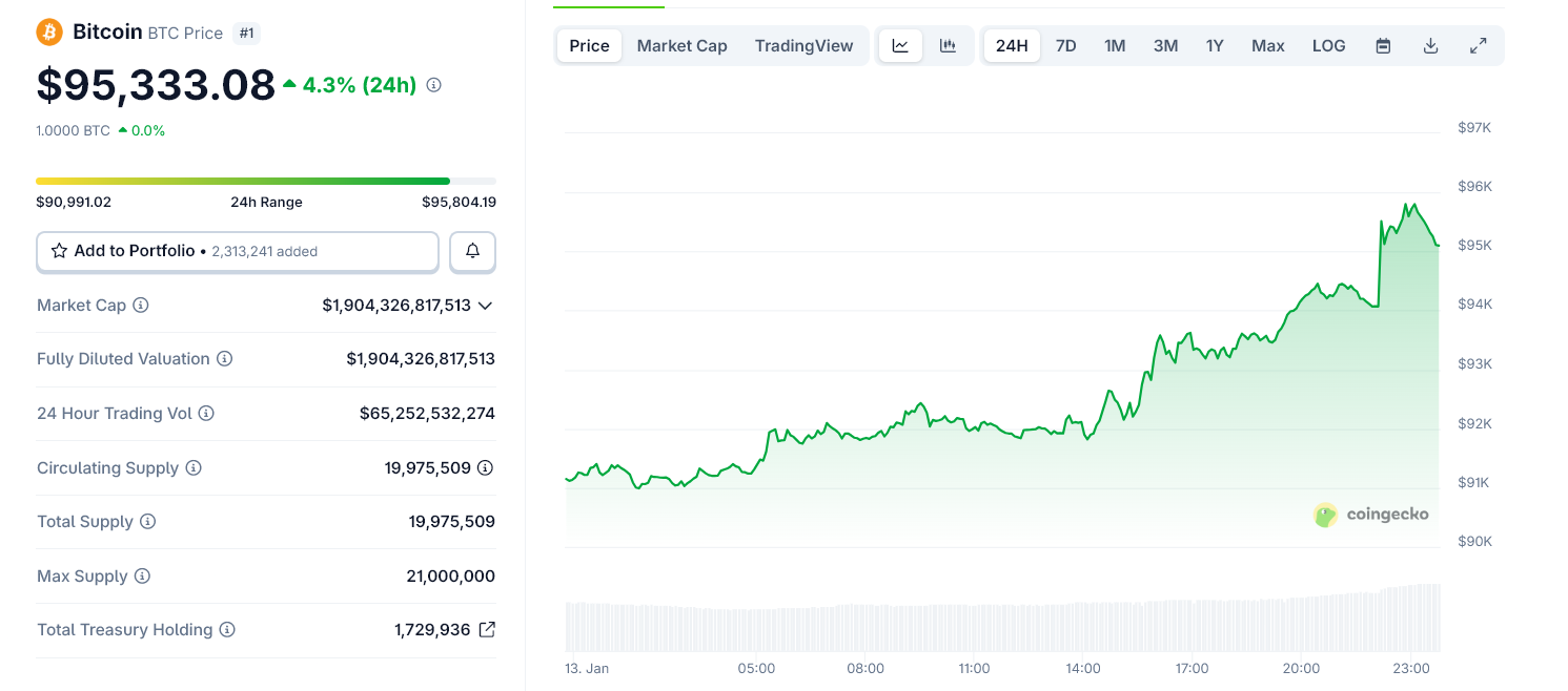 Bitcoin surged above $95,000 on Tuesday, reaching its highest level in more than 50 days, as a mix of easing US inflation and escalating geopolitical risk triggered a broad move into crypto markets.