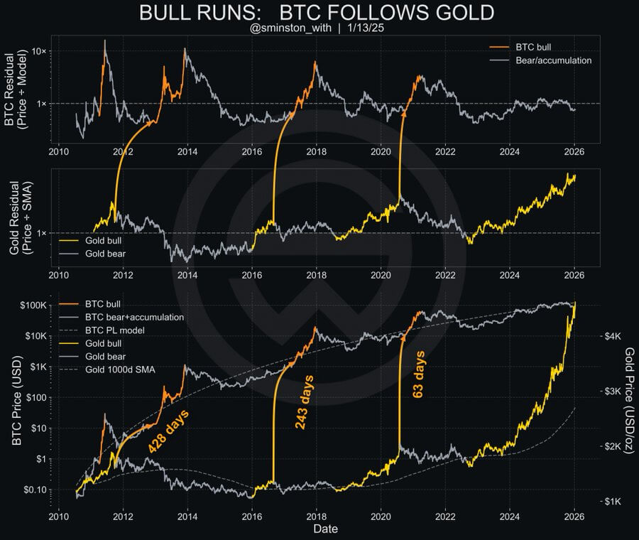 According to With, historical data reveals a recurring pattern in which gold bull runs precede Bitcoin breakouts.