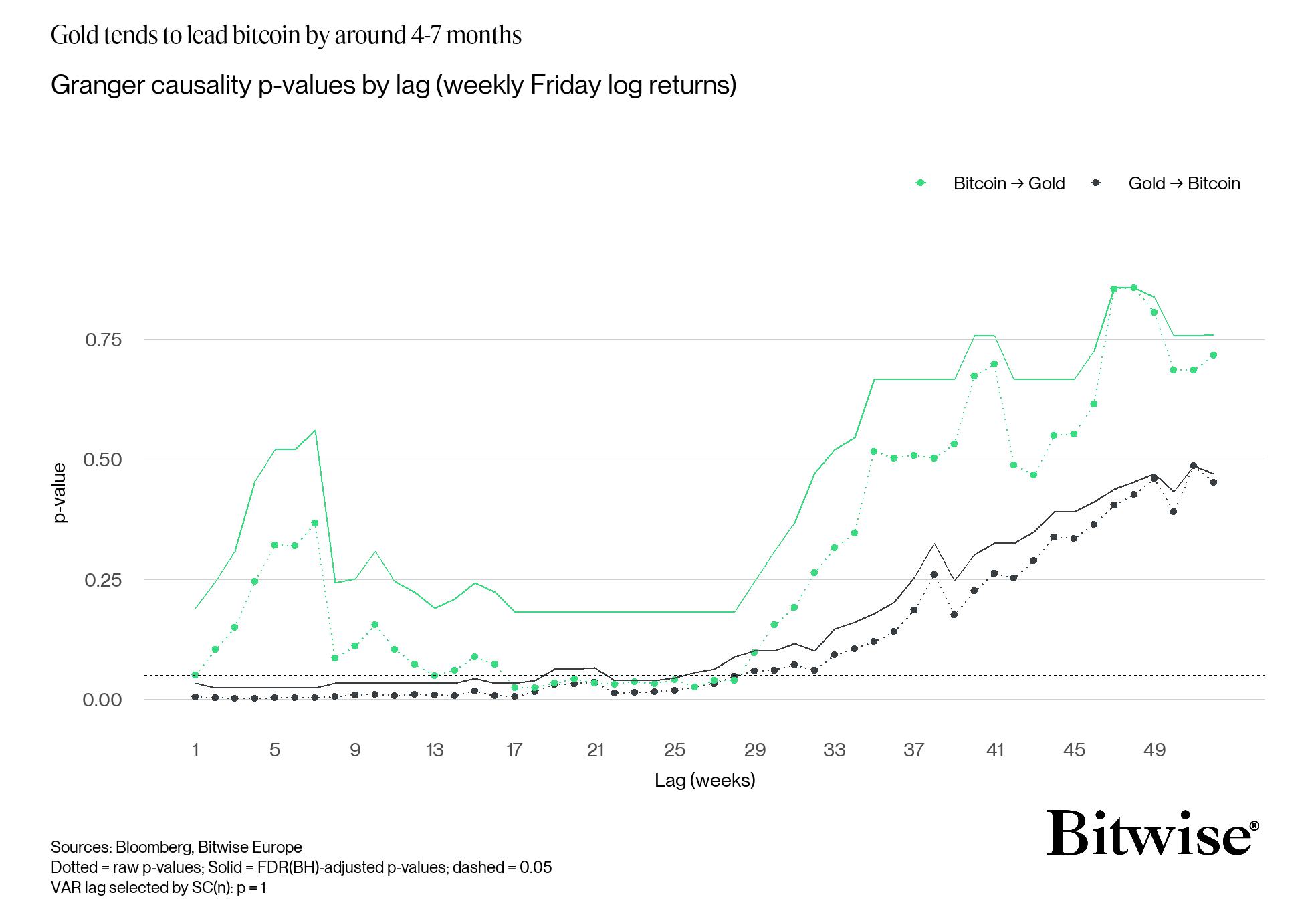 Dragosch, using Granger causality tests, pointed out that gold tends to lead Bitcoin by approximately four to seven months.