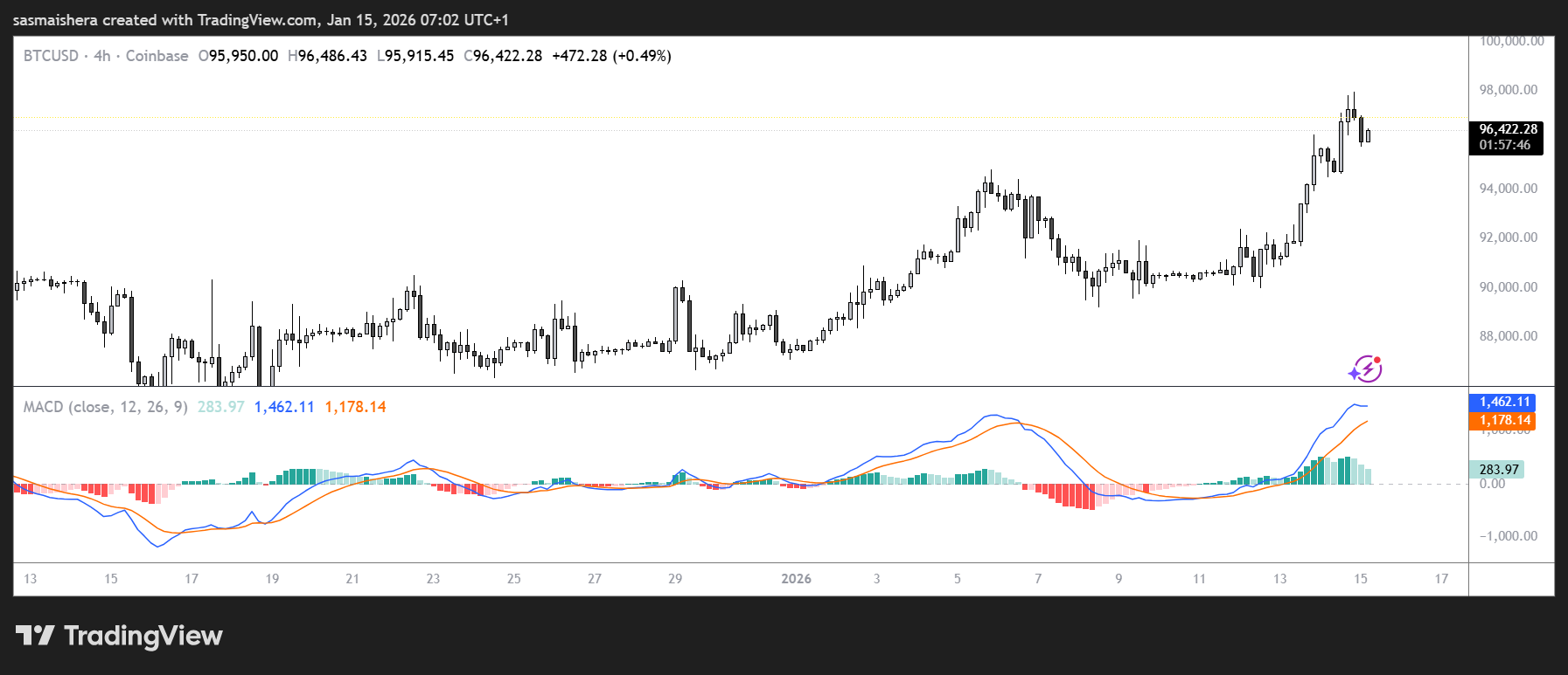 The BTC/USD 4H Chart is bullish and efficient as Bitcoin is currently trading above $96k.